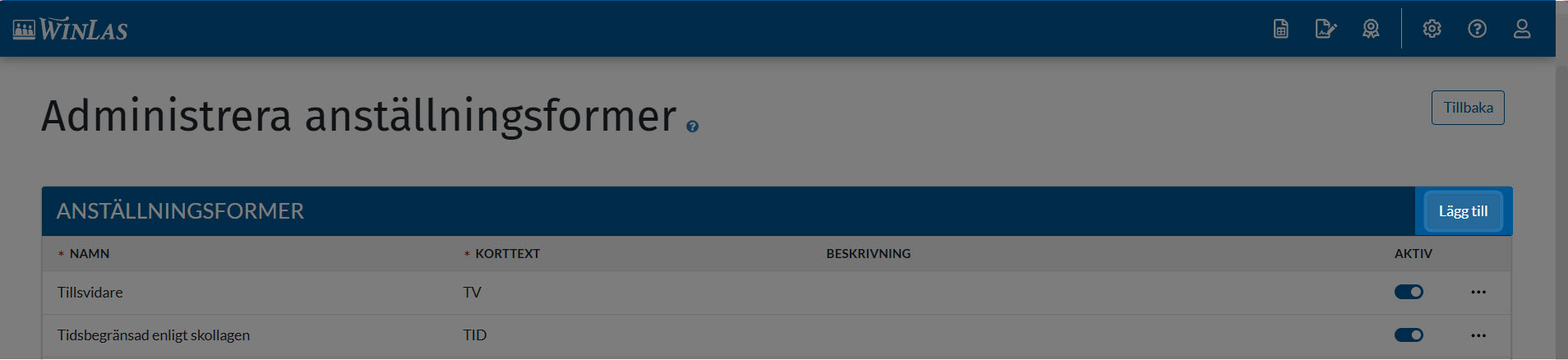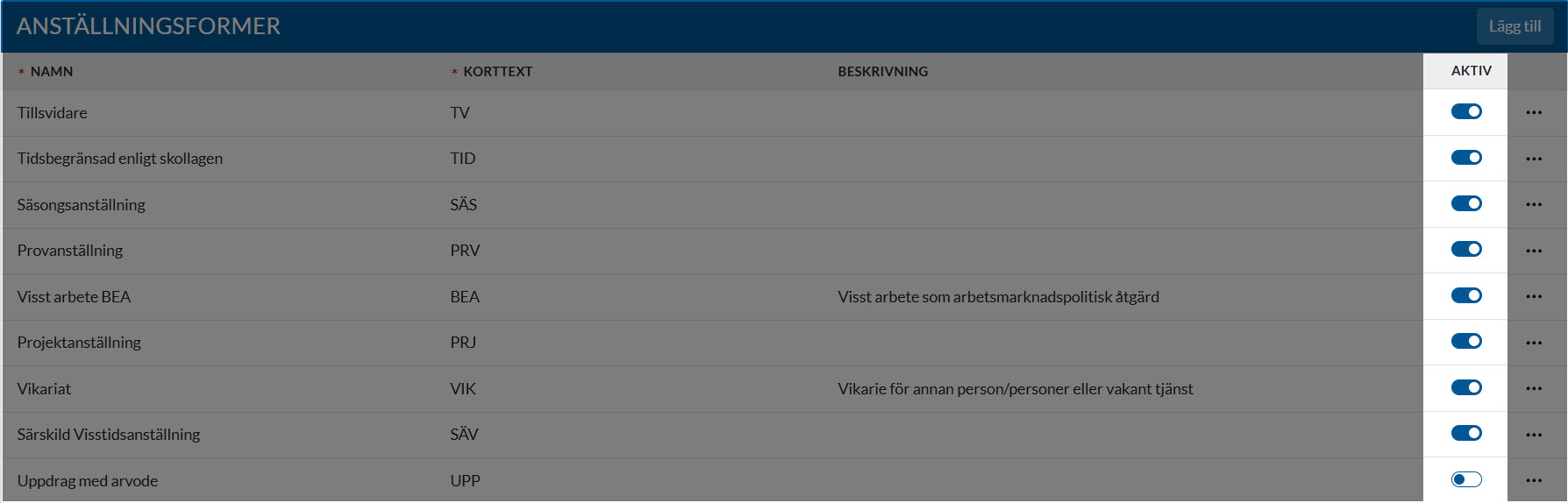 För att inaktivera en anställningsform används switchen till höger. En inaktiverad anställningsform kan ej längre väljas när ett nytt anställningsavtal skrivs.