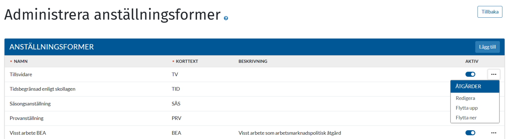 Ordningen anställningsformerna visas i tabellen avgör i vilken ordning dessa kommer vara valbara i anställningsavtalsformuläret. För att ändra ordning klicka på de tre punkterna längst ut till höger och välj Flytta upp eller Flytta ner.
