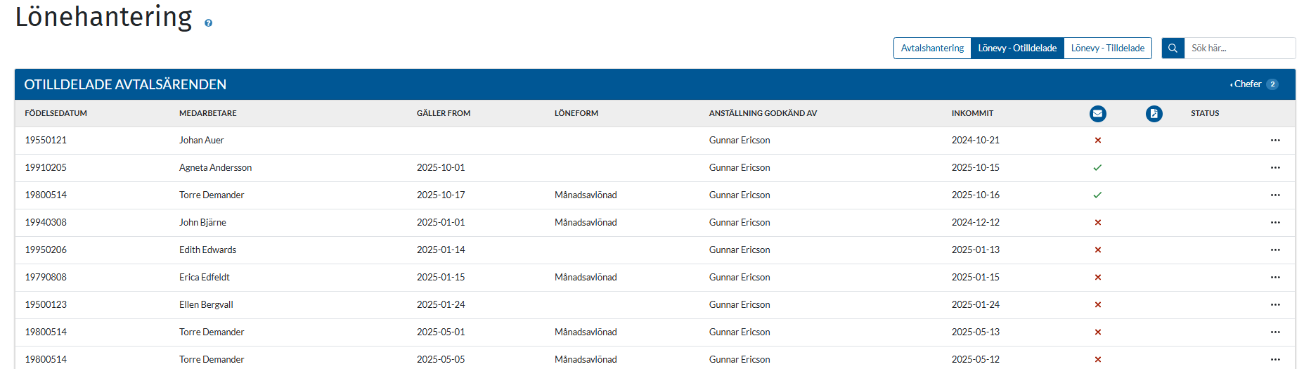 I denna vy visas avtalen i en listvy med kolumner som visar födelsedatum på medarbetare som avtalet gäller för, namn på medarbetare som avtalet gäller för, när avtalet gäller från, avtalets löneform, vem som godkänt avtalet, när avtalet inkommit underskrivet. Ikonen med det lilla brevet visar om avtalet är skickat till signering eller ej. Ikonen med pennan och pappret visar om ett avtal inkommit underskrivet eller ej i form av en grön bock. Rubriken Status visar huruvida ett avtal är makulerat eller ej. Det går att klicka på respektive rubrik för att sortera efter önskad kategori. Längst ned i listan kan man välja att visa fler avtal. Observera att det nu inte kan dyka upp tidigare skapade avtal ovanför de redan visade utifrån vald sortering. Tidigare versioner av anställningsavtalsmodulen hade vissa problem med detta. Vald sortering ligger också kvar när man visar fler avtal.