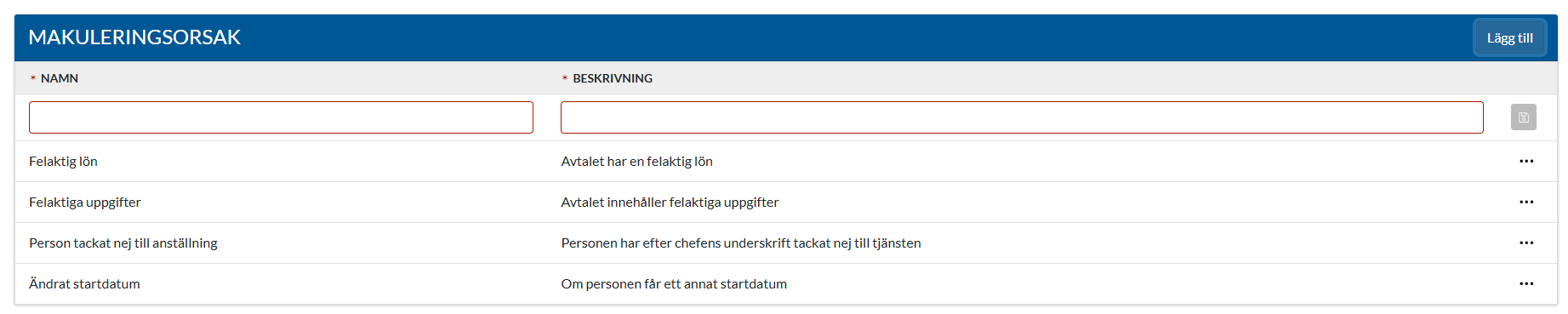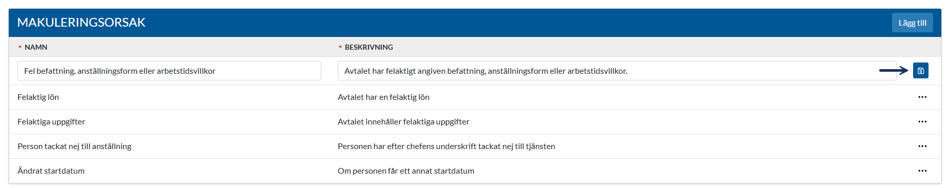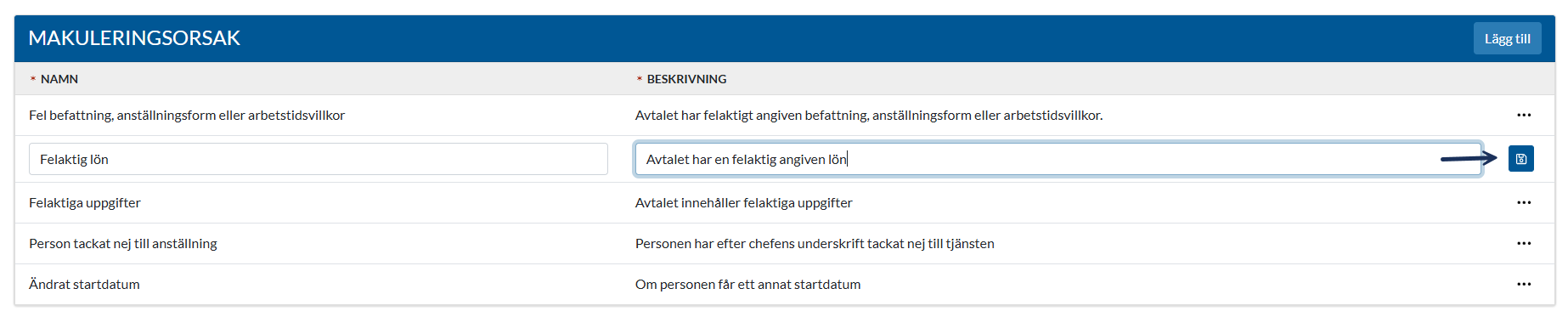 - Ange en Beskrivning som förtydligar vad makuleringsorsaken innebär och när den ska användas