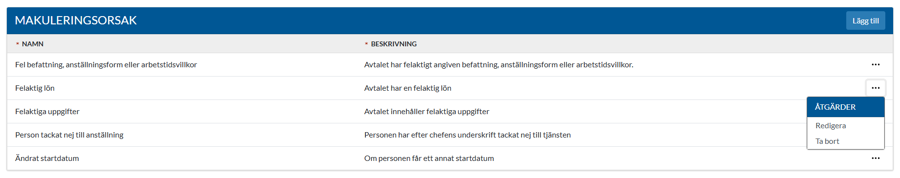 Makulering innebär att ett anställningsavtal ogiltigförklaras. När ett anställningsavtal makuleras kan den som makulerar anställningsavtalet ange en makuleringsorsak. Makuleringsorsaken gör det möjligt att i efterhand förstå varför åtgärden vidtogs och minskar risken för fel eller missbruk. Makuleringsorsakerna som anges gör det också möjligt att upptäcka återkommande interna problem och förbättra rutiner eller kunskapen hos de som skriver anställningsavtalen.