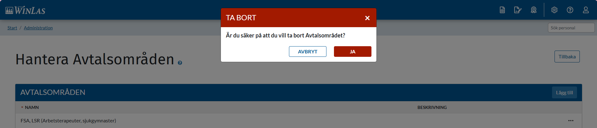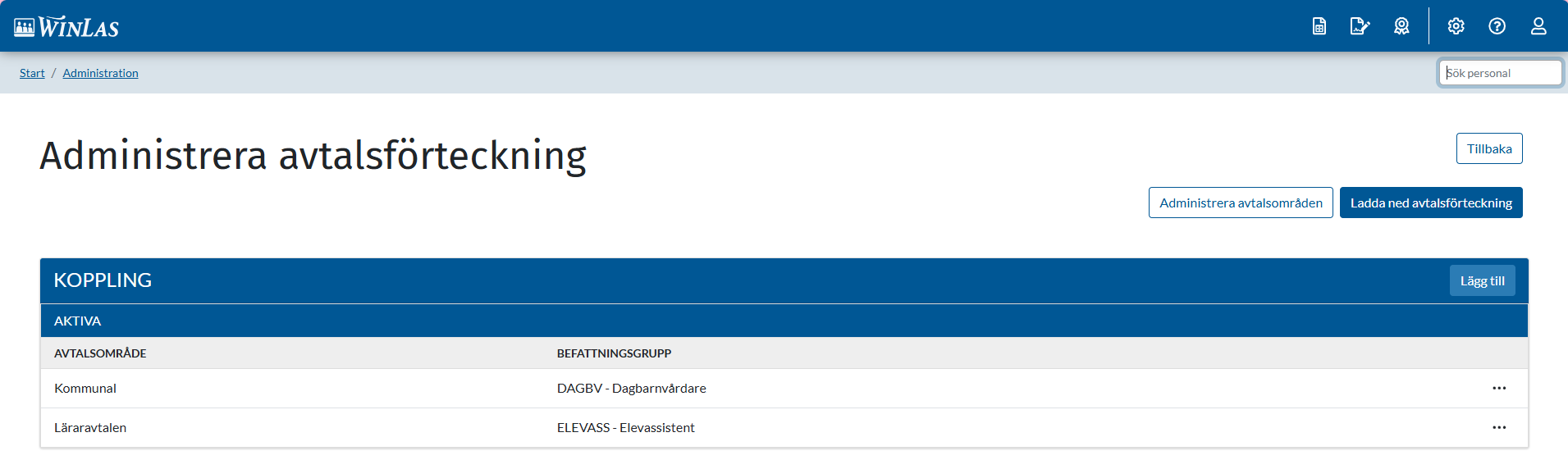 Saknas ett avtalsområde går det bra att direkt i WinLas Webb lägga upp ett nytt. För att lägga till ett nytt avtalsområde gör följande: