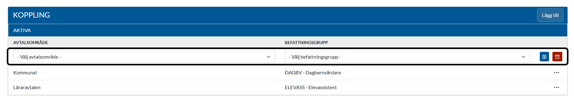 Ska ett avtalsområde kopplas till flera olika befattningsgrupper måste en ny rad/koppling skapas för respektive befattningsgrupp.