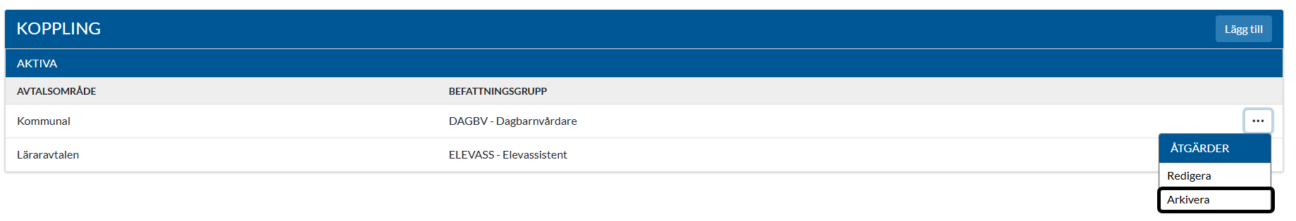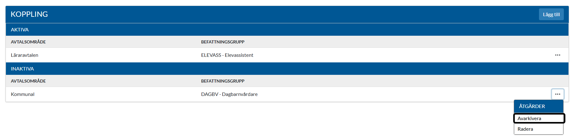 Arkivera/aktivera avtalsområde med koppling till befattningsgrupp