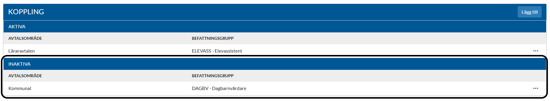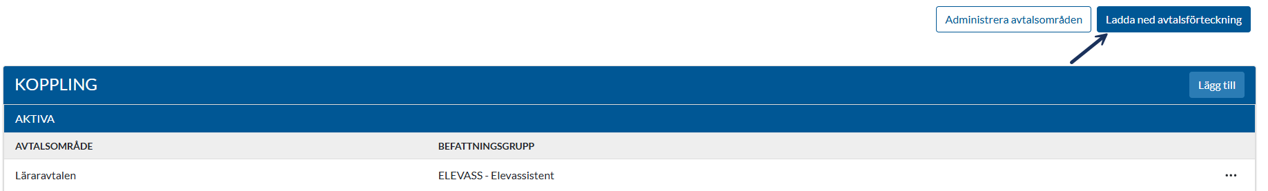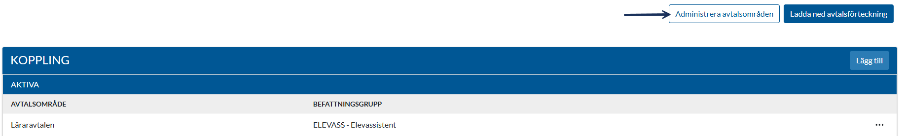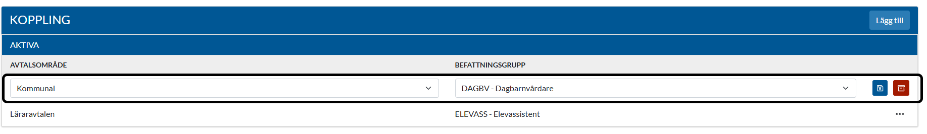 Tabellen visar aktiva kopplingar mellan ett specifikt avtalsområde samt en befattningsgrupp.