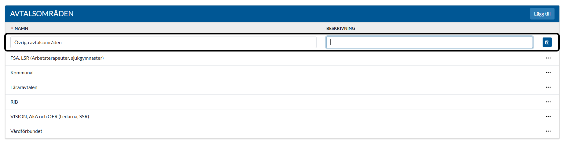 För att redigera ett befintligt avtalsområde, klicka på de tre prickarna längst ut till höger och välj Redigera. Gör önskade ändringar och klicka därefter på spara disketten längst till höger.