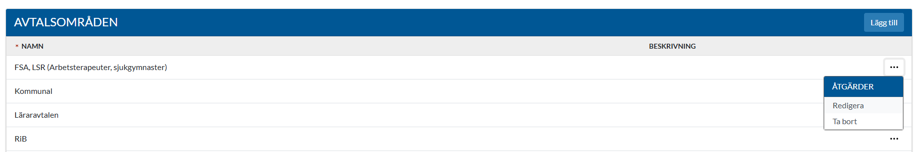 För att ta bort ett befintligt avtalsområde, klicka på de tre prickarna längst ut till höger och välj Ta bort. Bekräfta att avtalsområdet ska tas bort i dialogrutan som visas.