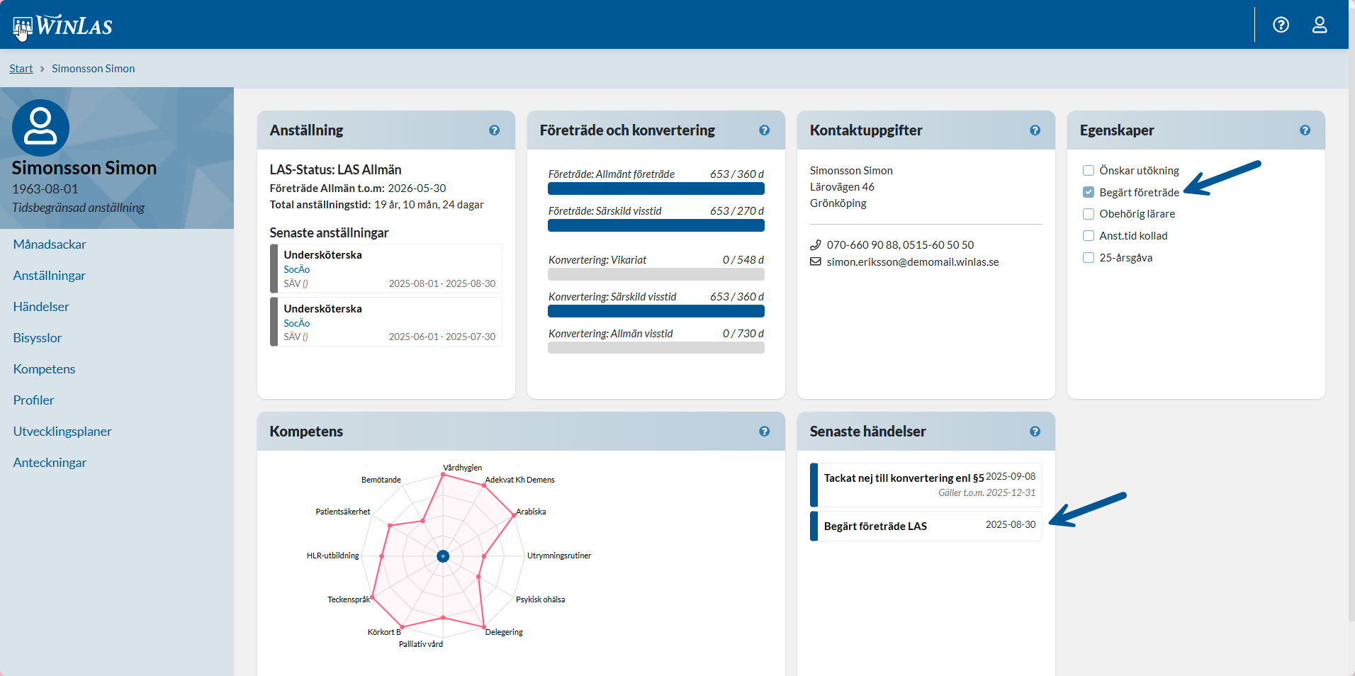 Som medarbetare kan jag ges inloggning till WinLas Webb samt ges behörighet att själv registrera min begäran om företrädesrätt. För att en begäran ska kunna registreras måste dock först ett beskedbrev skrivits ut. Detta görs vanligtvis av ansvarig chef eller av HR.